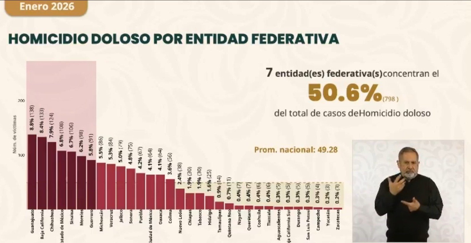 En Campeche, de enero de 2025 a enero de 2026, se presentó una baja del 42.9 por ciento en el promedio diario de homicidios dolosos, al tiempo que 26 entidades del país también registraron descensos en este indicador, lo cual fortalece, según la gobernadora, el progreso hacia un México y un Campeche más seguros con el apoyo de la ciudadanía.