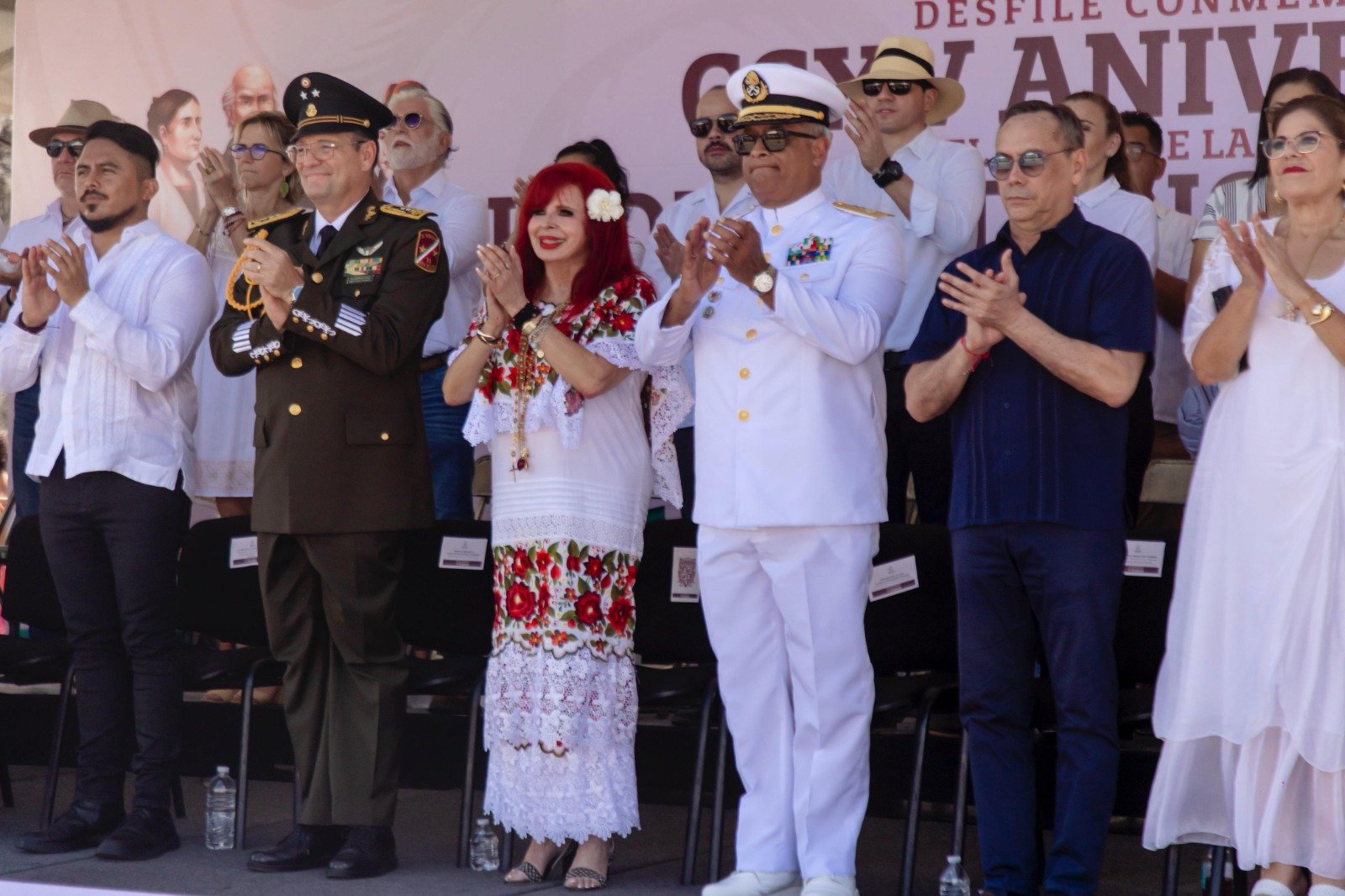 En compañía de autoridades militares, civiles y del gabinete estatal, la mandataria ofreció honores al Lábaro Patrio y vio desfilar a los contingentes desde el presídium situado frente al edificio Torres de Cristal. Entre quienes asistieron se encontraron la presidenta del Sistema DIF Estatal, Laura Sansores San Román; la secretaria de Gobierno, Liz Hernández Romero; y los comandantes de la 33.ª Zona Militar y de la Séptima Zona Naval, Gral. Alberto Román González Fernández y Vicealmirante Alfredo Ramón Enríquez Delgado, respectivamente.