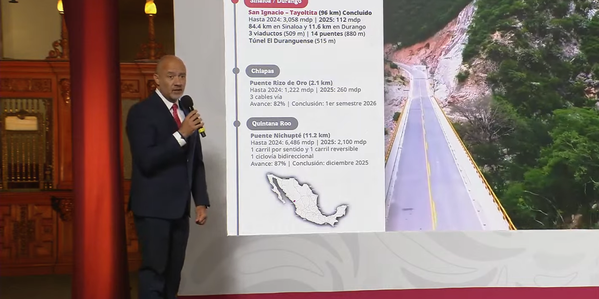 El titular de la SICT detalló que los proyectos incluyen obras en continuidad, ejes carreteros prioritarios, puentes, distribuidores viales y la rehabilitación de infraestructura afectada por huracanes en Guerrero. Además, se desarrollan ocho autopistas bajo esquemas de inversión mixta, con un monto de 14,000 millones de pesos para este año. Entre los avances destacados, Esteva Medina anunció la culminación de la carretera San Ignacio–Tayoltita, que conecta Sinaloa y Durango, abarcando 96 kilómetros, tres viaductos, 14 puentes y un túnel, mejorando la conectividad en una importante zona serrana del noroeste. Esta obra será inaugurada próximamente.