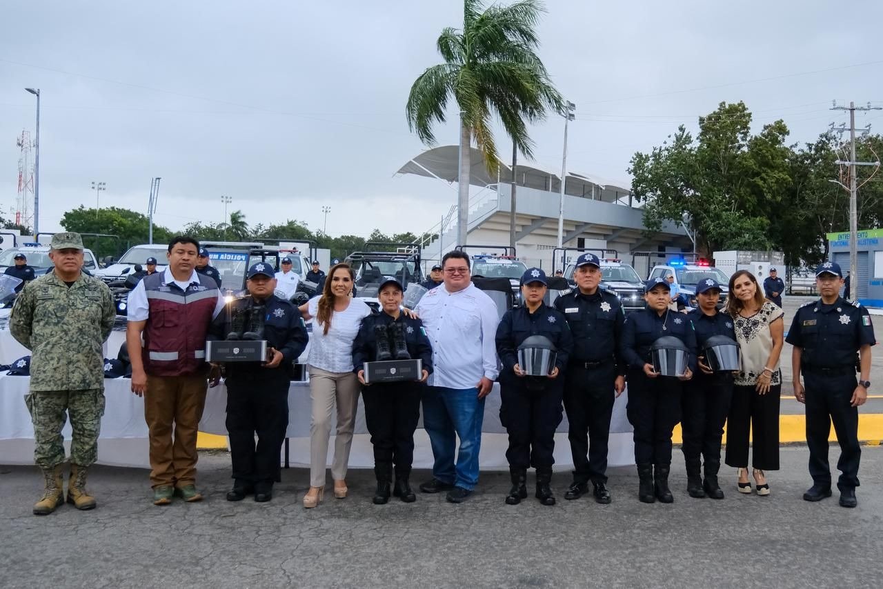 Cozumel.– Con el fin de proteger la vida, evitar la violencia y fomentar la confianza, la gobernadora Mara Lezama Espinosa lideró en Cozumel la actualización y refuerzo del parque vehicular, además de la distribución de prendas de protección, vestuario, uniformes, vehículos, mobiliario y equipo tecnológico destinado a la Policía Municipal, como componente de una estrategia integral para la construcción de paz que incluye un enfoque social y transparencia.