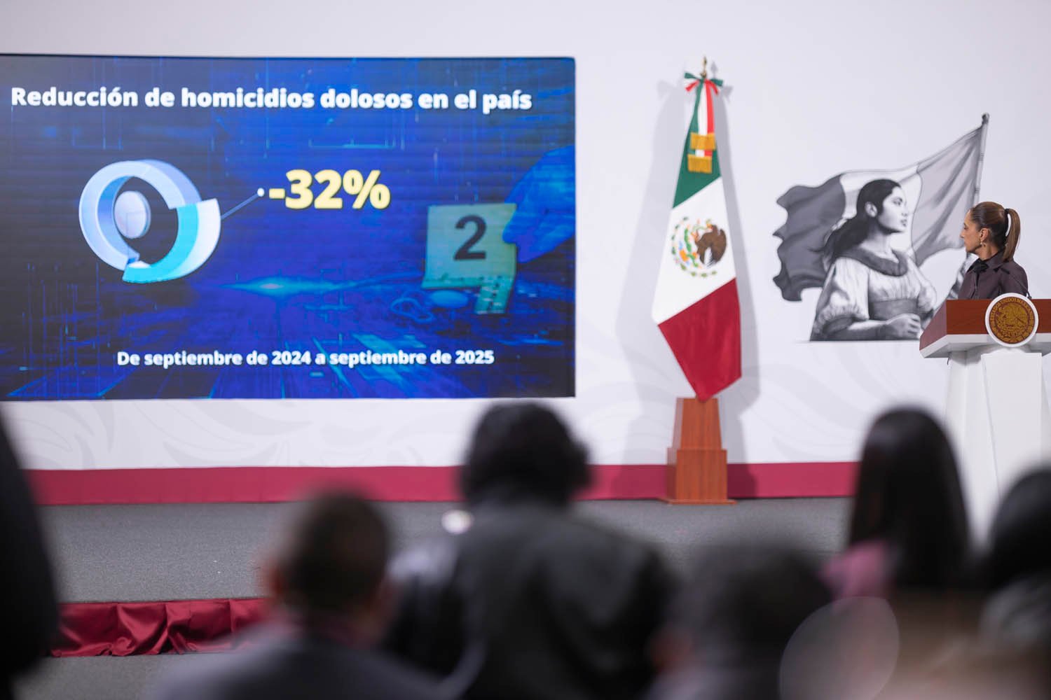 Según datos actualizados al 30 de septiembre, los homicidios en México han disminuido un 32 por ciento en comparación con el mismo mes de 2024. Al inicio de la administración, se registraban 86.9 homicidios diarios, cifra que se ha reducido a 59.5, lo que equivale a 27 delitos de este tipo menos cada día.