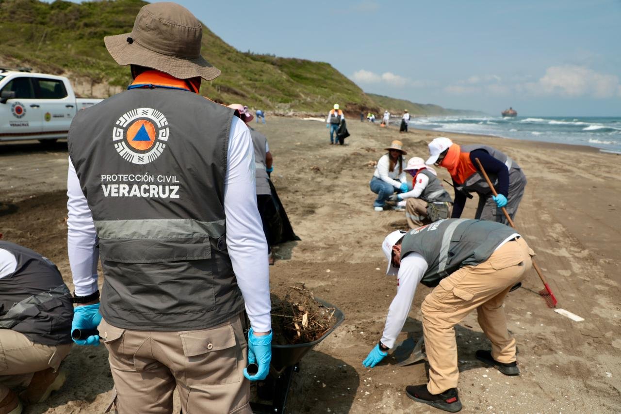 En Veracruz, bajo la coordinación del Grupo Interinstitucional del Gobierno de México, se mantienen activas las brigadas de limpieza en las playas con el objetivo de atender, contener y sanear, minimizando así los daños ambientales y sociales.